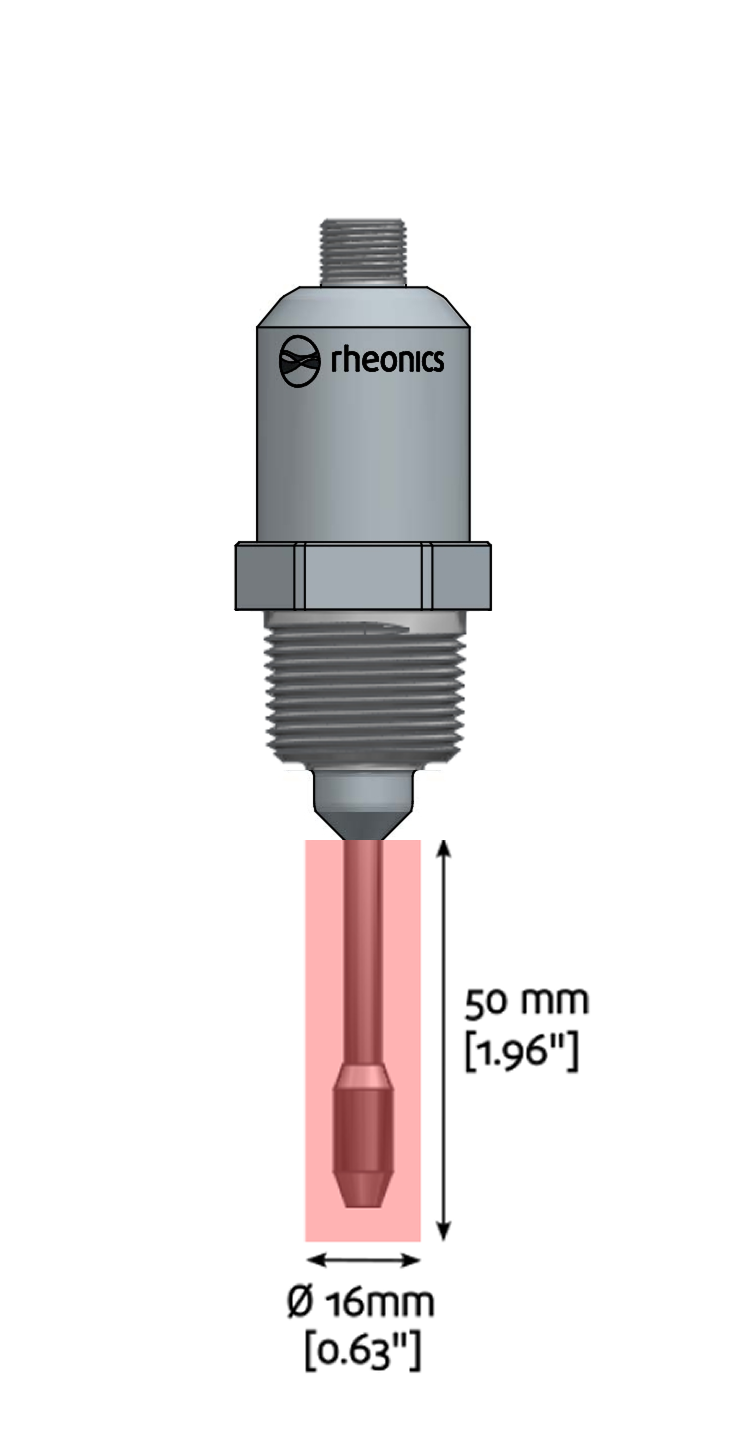 Rheonics SRV has a sensing element shown inside the red section in Figure 2. The sensor measures what is within a certain area called sensing area, so this should always be fully submerged in the fluid. This can be a problem when on a pipe, the flow rate is low and the pipe isn’t usually full, or when the sensor is installed too far out of the main pipe (like in a long standpipe) where fluid is not flowing but is almost static. Notice that a clearance of at least 5 mm is required between the sensor tip and a pipe wall or any other obstruction.