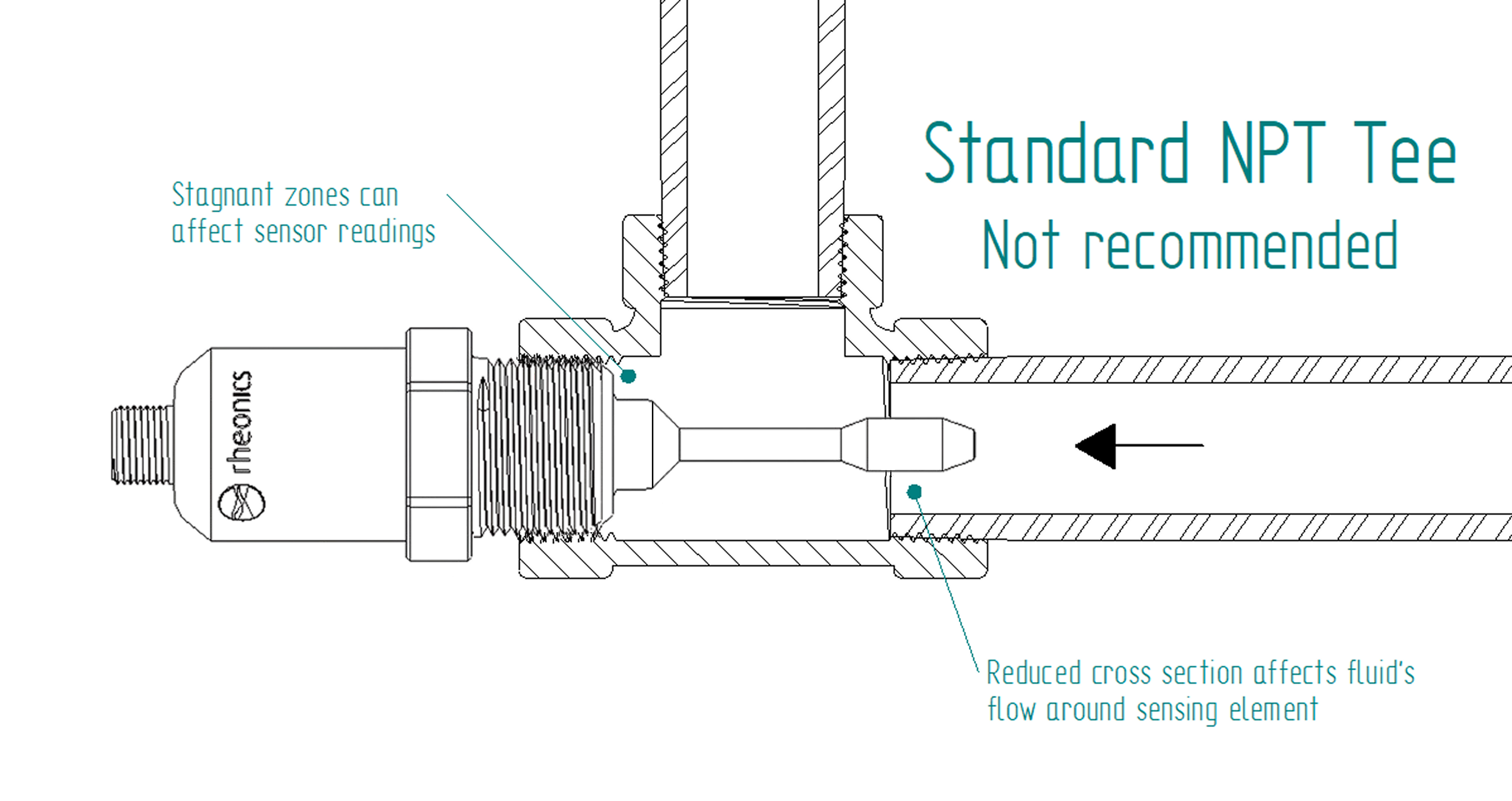 Potential issue explanation: A common mistake with installations of the SRV-X1-34N is using an off-the-shelf NPT Tee (Figure 5). An installation with the SRV, vertical or horizontally, mounted in such a Tee port, can be prone to stagnant and dead zones. Also, the SRV tip may pass through the tee and can be exposed to uneven inner walls that can create changes in the fluid’s flow lines (increasing turbulence) as in Figure 6.