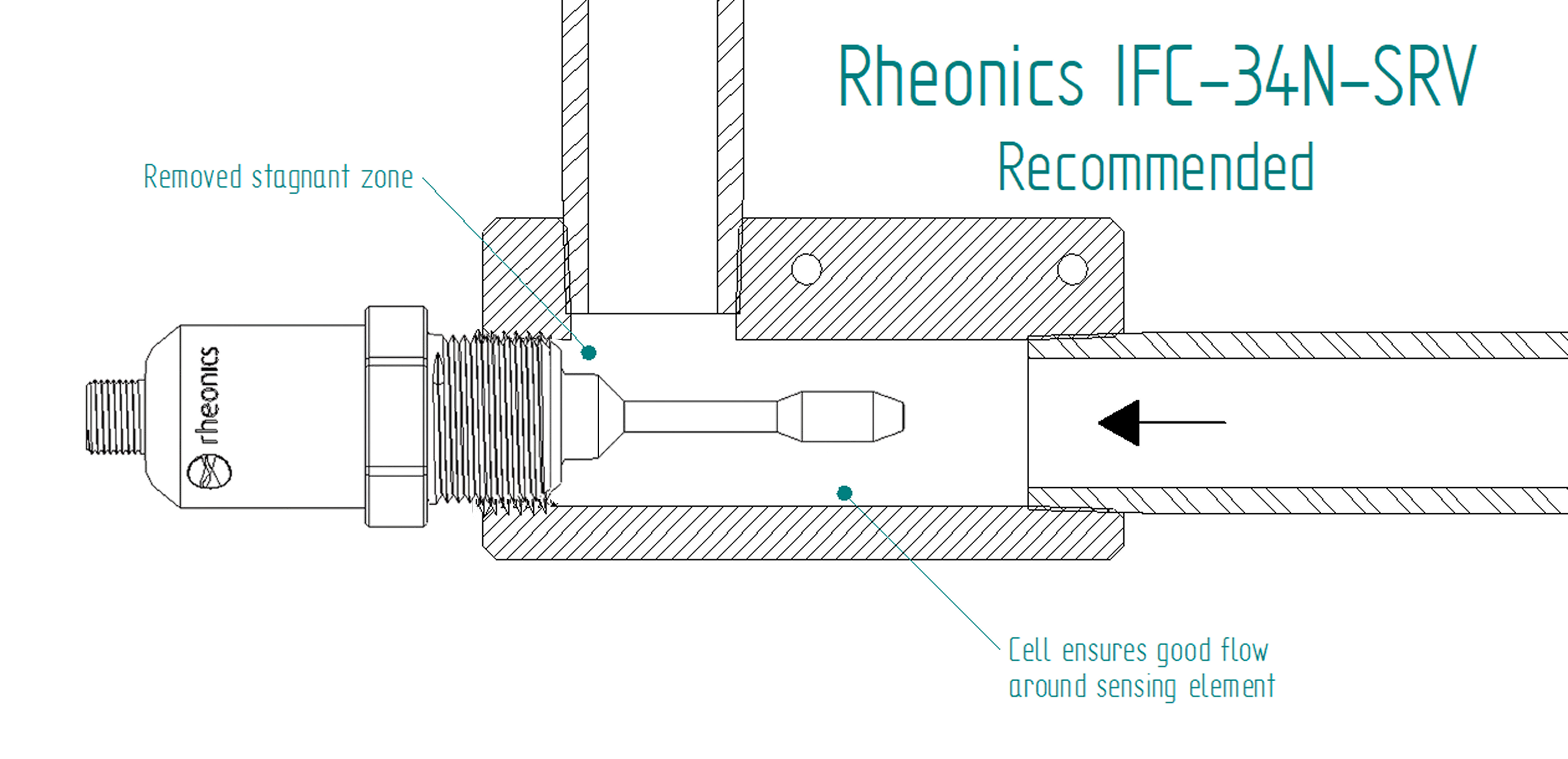 Recommendation: In these cases, the Rheonics IFC-34N-SRV is recommended to ensure the flow surrounds the sensing element properly and stagnant zones are removed as in Figure 7.