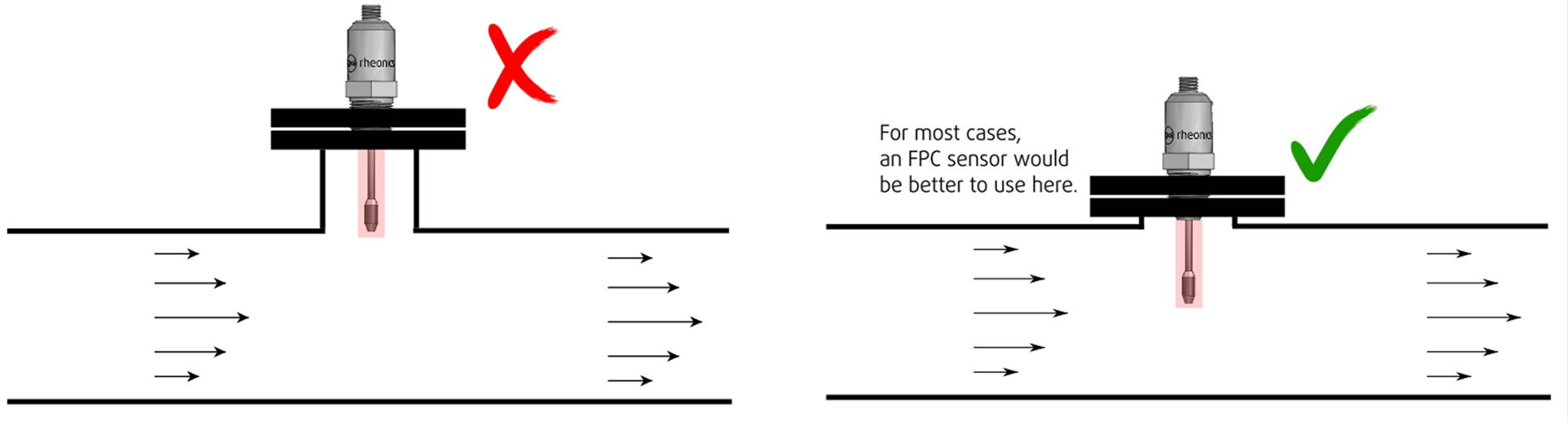 In line: Ensure the sensing element is exposed to fluid, and avoid stagnation and dead zones. Consider placing the sensor upwards or parallel to the fluid for small flow rates that can’t fully surround the sensing element.